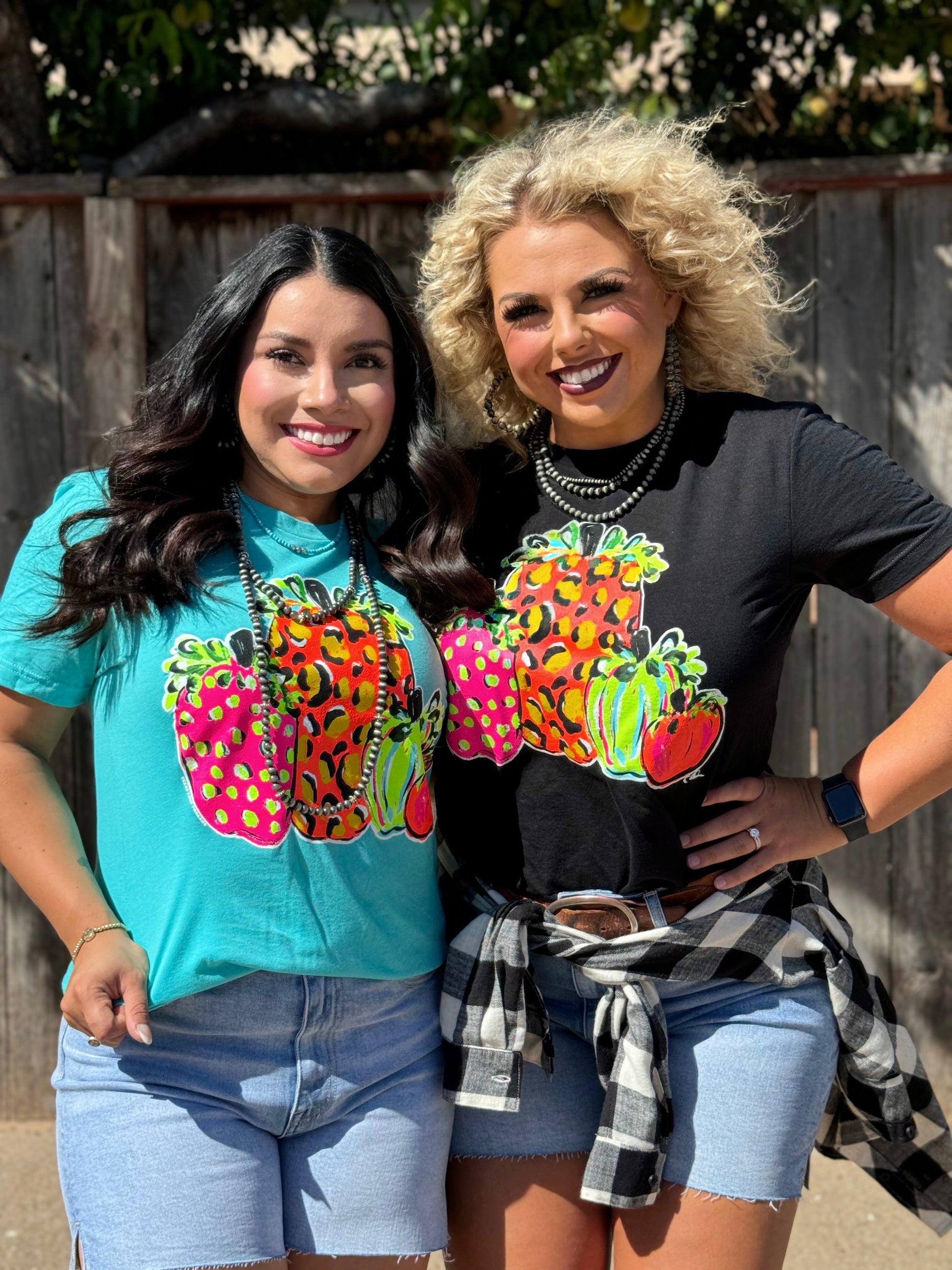 Shown on a solid black and sea green Bella Canvas t-shirt.