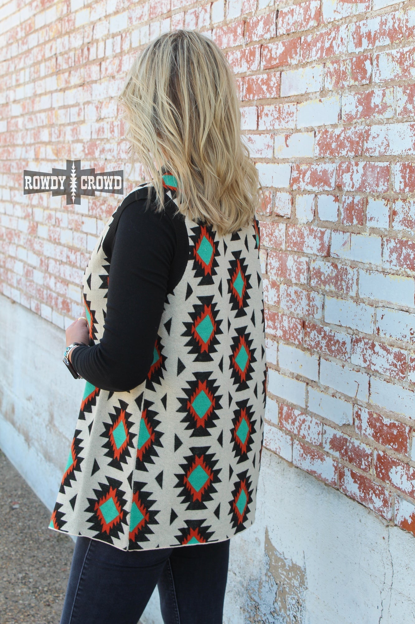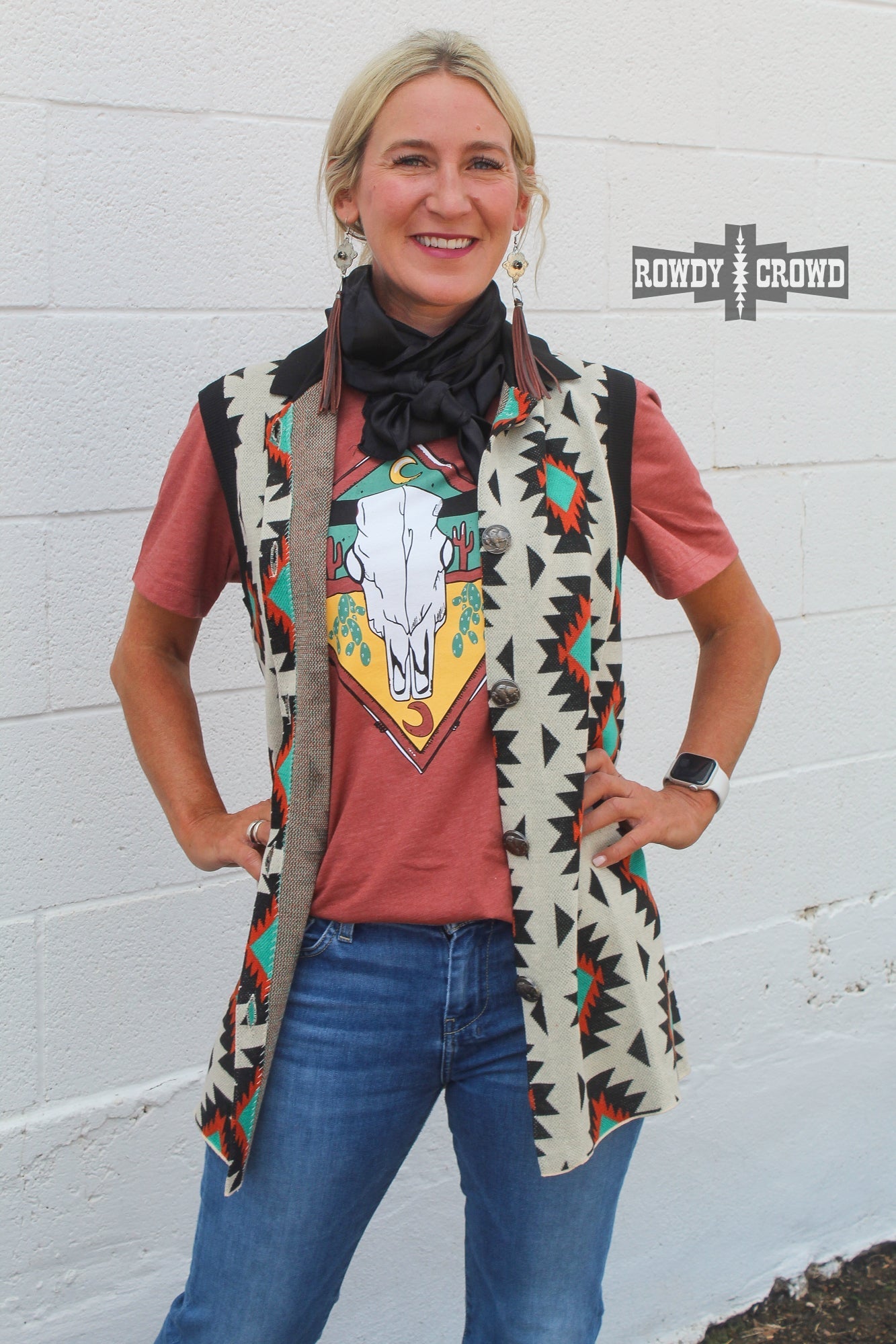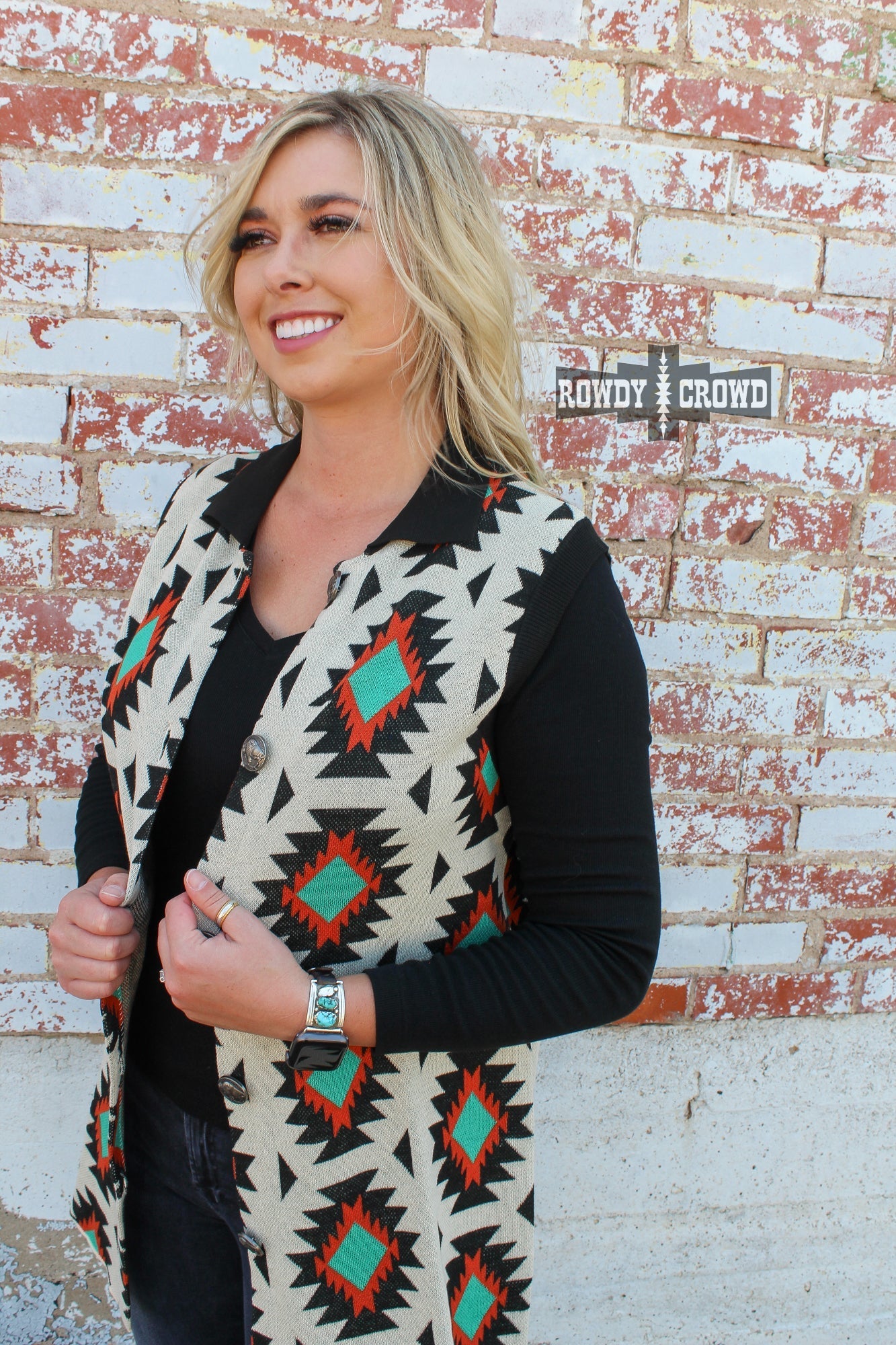The Vallejo Sweater Vest is a fall MUST! It is on a cream base, with turquoise and rust aztec detailing. The black collar and buffalo nickel buttons make this piece so unique!