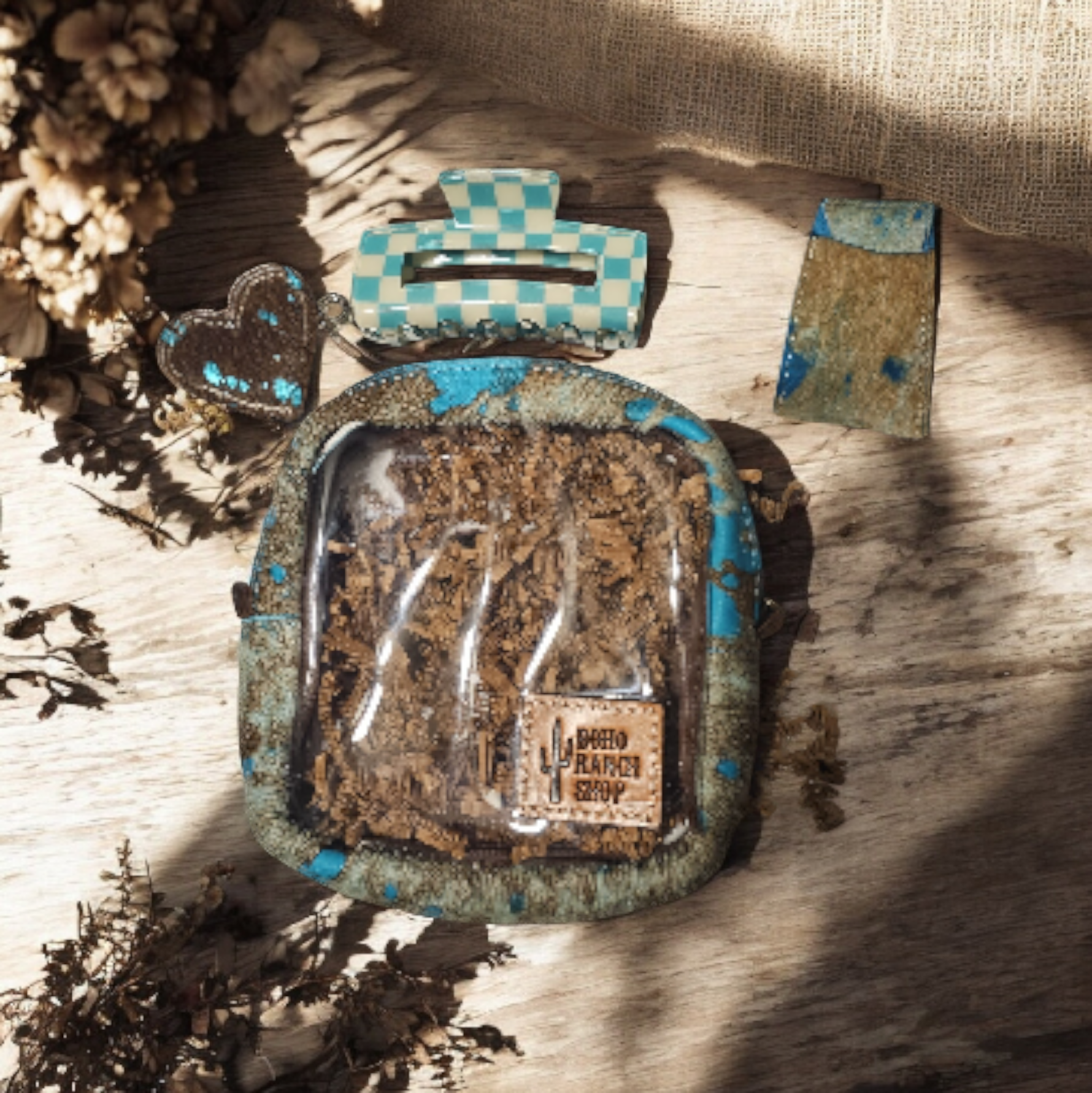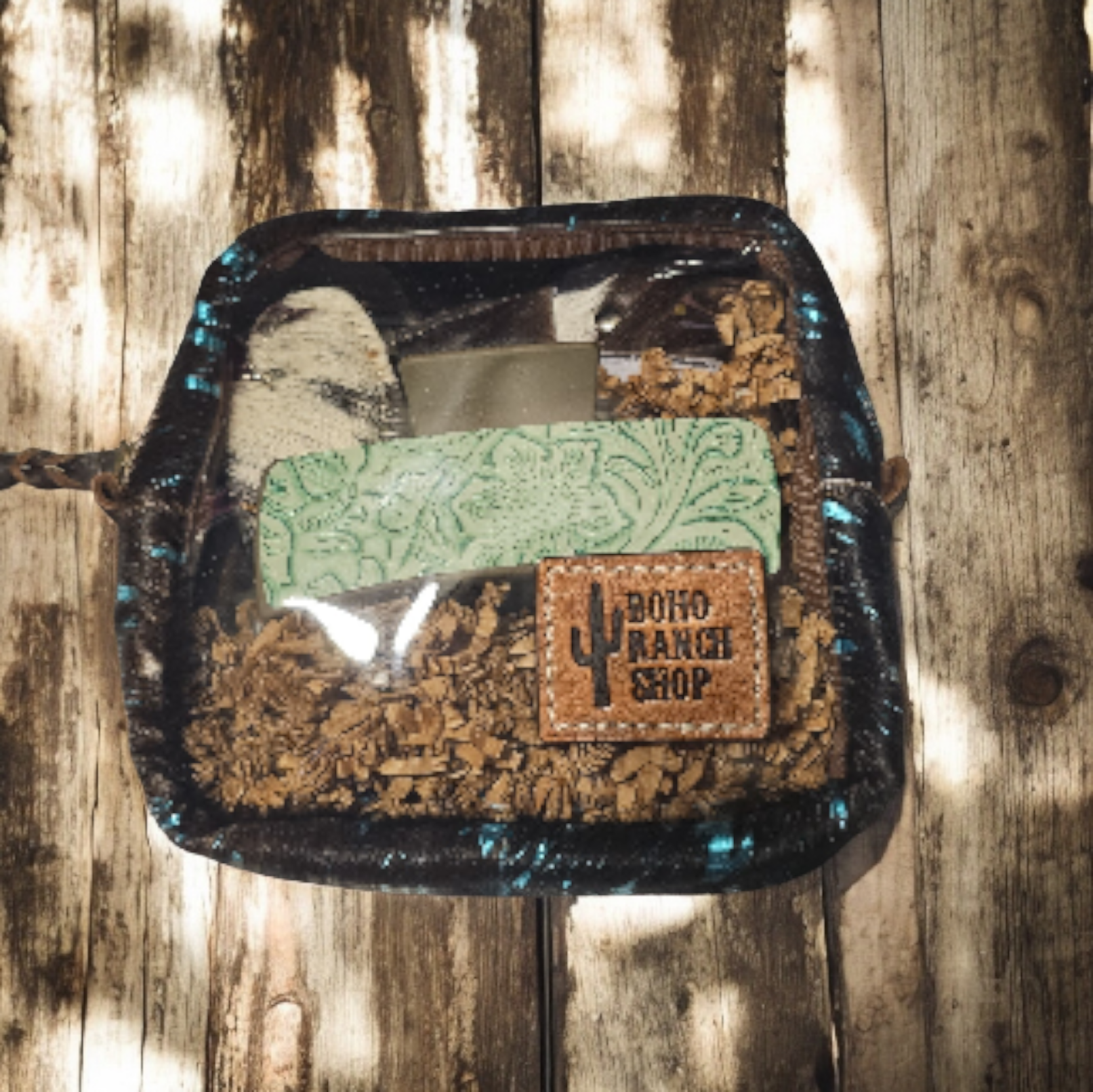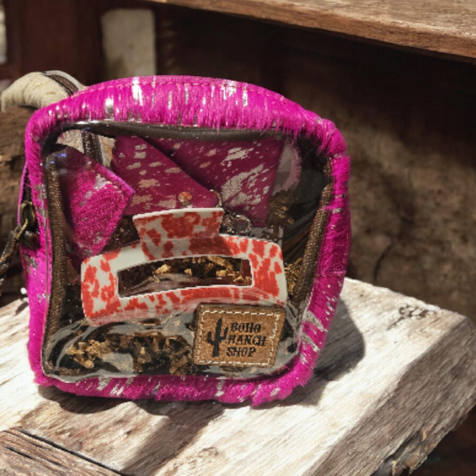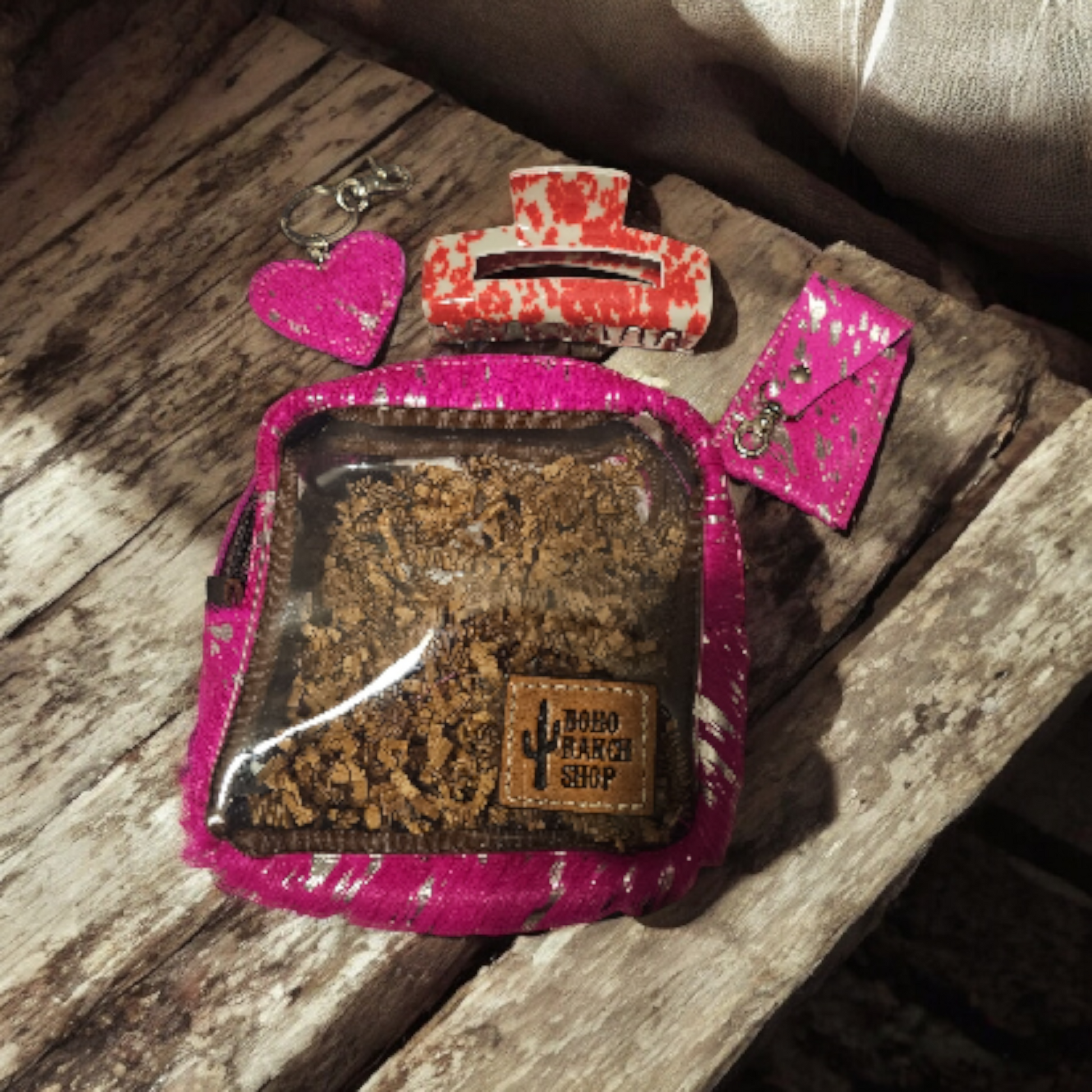 includes :Cowhide Cosmetic Clear Case - Toiletry Makeup Travel Bag,Western Heart Cowhide Hairon Keychain,Cowhide Chapstick Case Lip Balm Lipstick Case Holder,HairClip