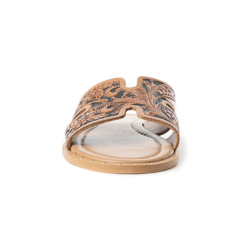 Step into luxury with these artisanal leather slides featuring intricate tooled floral designs. The rich cognac hue and classic H-strap silhouette blend Western charm with modern sophistication. Footbed designed to ensure all-day comfort. Perfect from sidewalk to sunset!