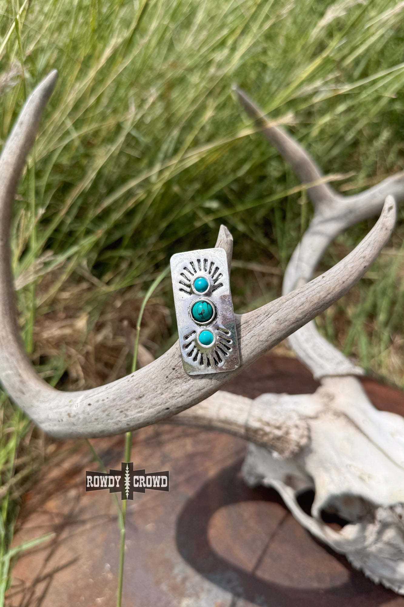 The Ringo Scarf Slide brings a rugged edge to classic Western style. Detailed with traditional hand-stamped patterns, two smaller turquoise beads, and centered around a bold turquoise bead, it’s a standout piece that pairs perfectly with any neckerchief or wild rag.